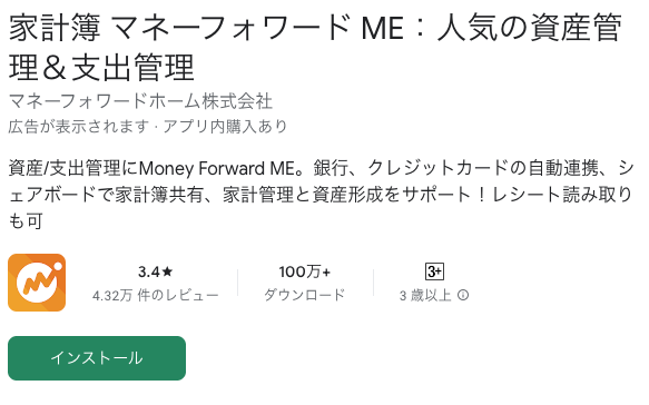 Google Play → 「マネーフォワードME」で検索 → 「インストール」