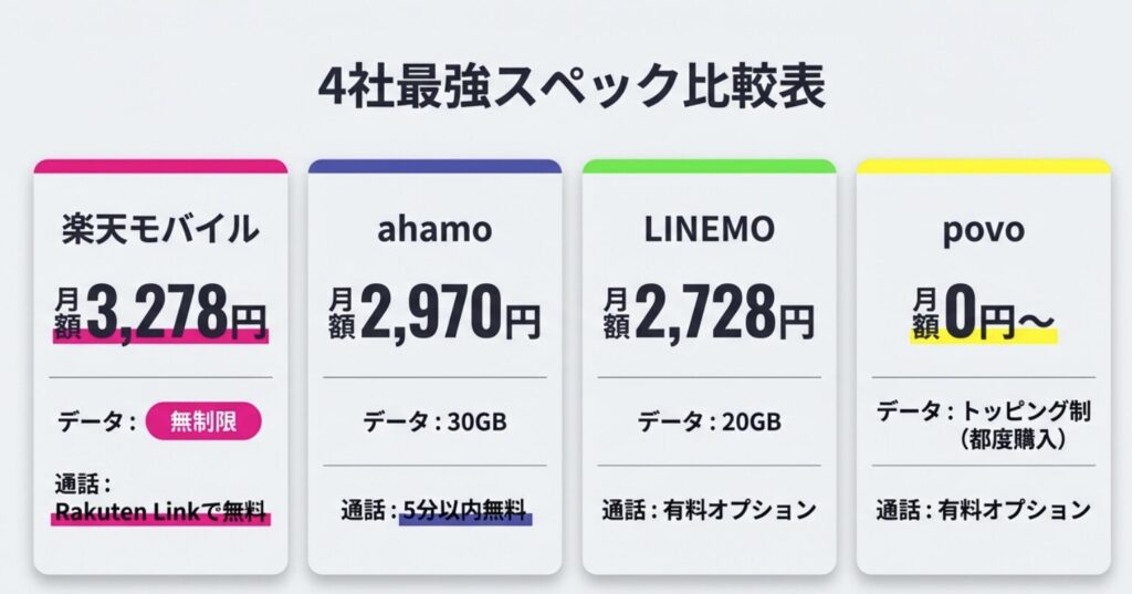 | 楽天モバイル | 3,278円 | 無制限 | Rakuten Linkで無料 |