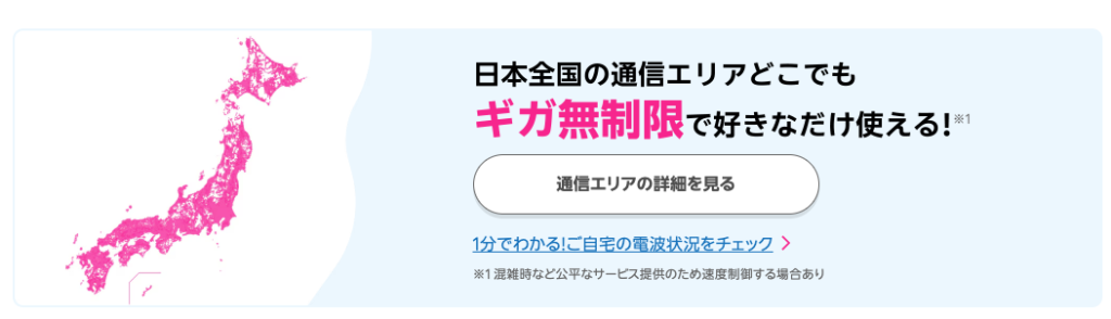 2026年時点の人口カバー率は99.9%に達しており、2024年からプラチナバンド(700MHz帯)の提供も開始されています。建物内や地下での繋がりやすさは改善傾向にありますが、大手キャリアと比べると屋内・地下で弱くなるエリアは依然存在します。