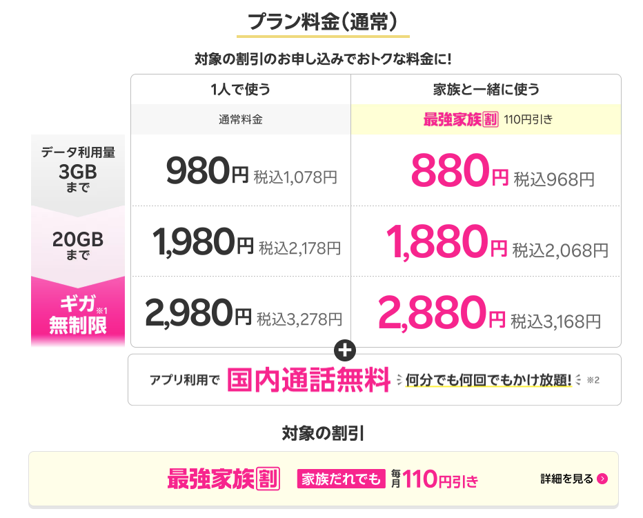 家族で複数回線を契約する場合、1回線あたり月110円の割引が全員に適用されます。