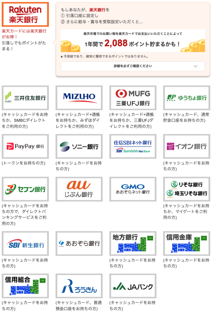 楽天銀行との連携をおすすめ:楽天カードの引き落とし口座を楽天銀行に設定することで、審査が通りやすくなると言われています。同時にSPU還元率も上がるため、一石二鳥です。