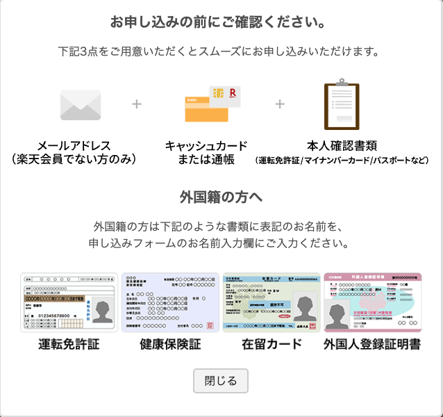 必要書類:運転免許証やマイナンバーカードなどの本人確認書類があれば、基本的に大丈夫です。ただし、楽天会員のアカウントを事前に作成しておくと、申し込み手続きがスムーズになります。