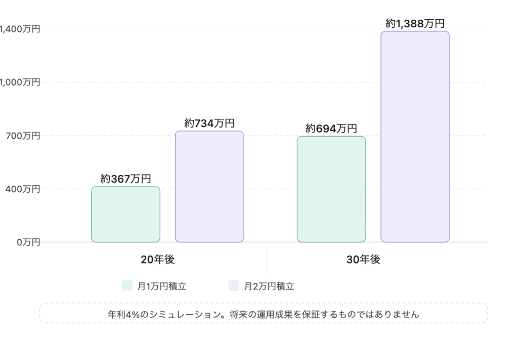 月1万円の節約で生み出した資金をそのまま積立に加え、合計月2万円にした場合のシミュレーションです(年利4%)。