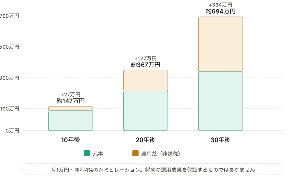 月1万円・年利3%・30年運用で比較した場合: